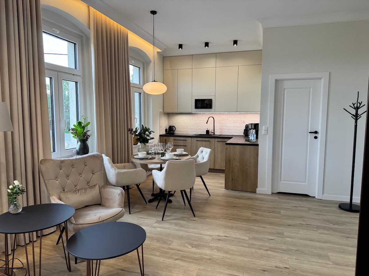 Przestrzenny i przyjemny apartament 50m2 z osobną sypialnią, dużym salonem z rozkładaną sofą dla dwóch osób i dwoma telewizorami. W apartamencie znajduje się dobrze wyposażona kuchnia oraz dostępna jest pralka. Łazienka z wygodnym prysznicem. Możliwość zakwaterowania ze zwierzęciem, opłata wynosi 100 zł/zwierzę za cały pobyt.