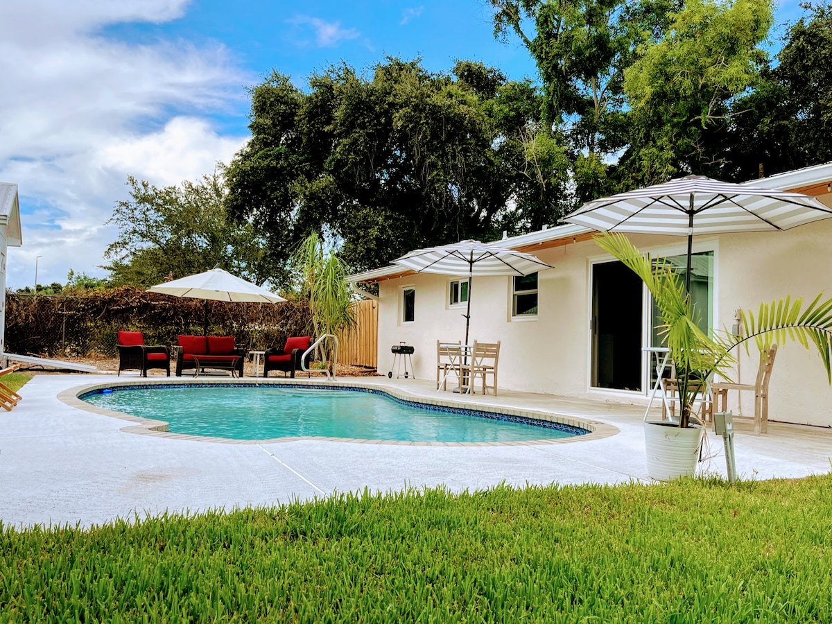 Fabulous 2 bedroom home with a private salt water pool. Whether traveling to Stuart for work or pleasure, you will love the relaxed vibe of this home. Great outdoor spaces for enjoying the beautiful weather with a private fenced front yard area and pool and backyard area. We are centrally located with a 10 min drive to the beach and downtown. We are within walking distance to restaurants, nightlife, grocery shopping, medical center, pharmacy and other shopping