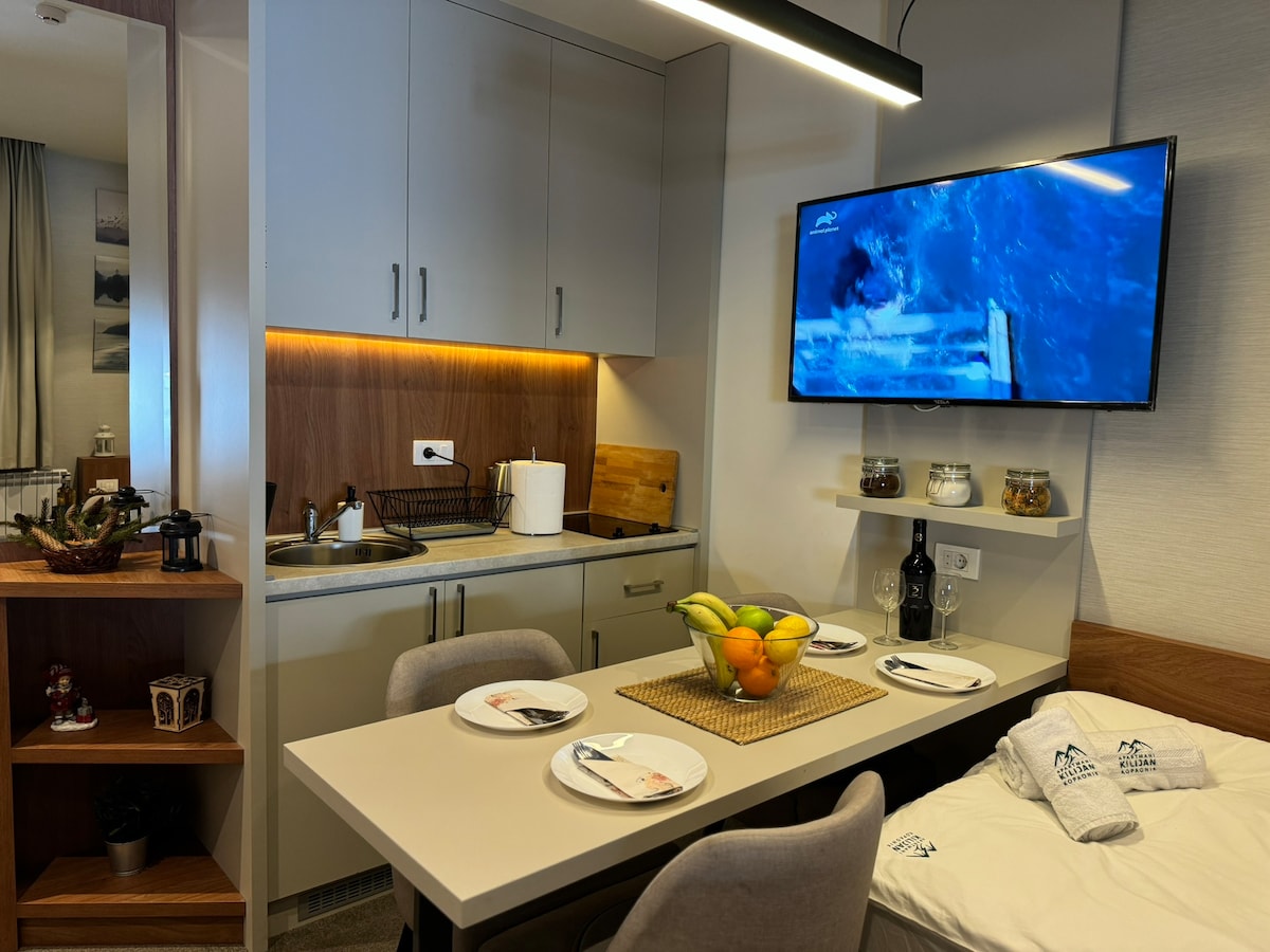 Cozy 1-room apartment in Milmari Resort, Kopaonik. Sleeps up to 4, with a romantic balcony view. Enjoy spa centers with saunas, indoor/outdoor pools (extra fee). Just 3 km to ski slopes and 6 km to Kopaonik center—accessible by car or winter shuttle. Ideal for couples or families. Free garage parking included. Perfect for a cozy mountain getaway with comfort, views, and wellness nearby.
