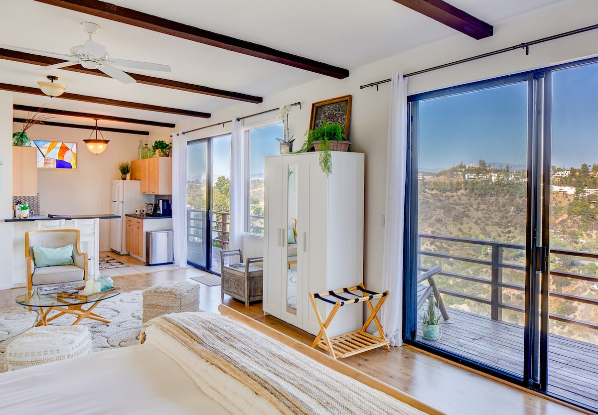 A private, quiet 500 sqft studio has unlimited Mountain Views offers creative professionals & travellers an incredibly luxurious stay in Studio City. A kitchenette has essentials to heat meals easily, a kettle for tea drinkers and a Nespresso Coffee machine. Luxury linens and fine china are provided. CBS, ABC, Warner Bros and Universal are five minutes away. 180m to Dance Millenium. Feather and Fur free. Private external access via two sets of steps. A secret hideaway. (Blockout Curtains)