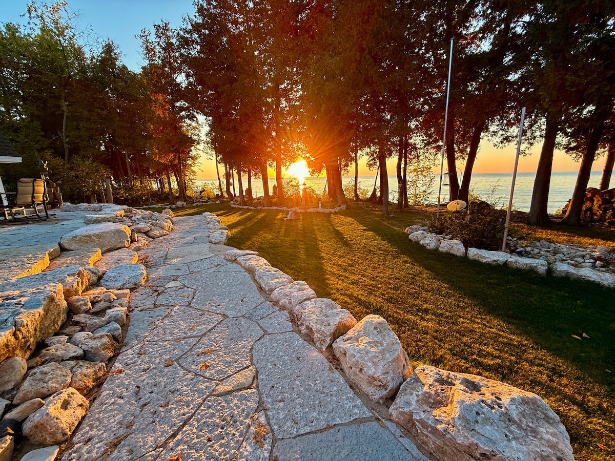 Beautiful 4 season, private 2 bedroom Knotty Pine Cottage located on the shores of Lake Michigan just 10 yards away from water in Sturgeon Bay, WI. 2 BR/1 bath cottage with beautiful stone, wood burning fireplace. A fully equipped kitchen with high bar dining which seats 8. Lots of living space with leather sectional and full size hide-away sofa sleeps 2, Main Guest Room 1 w/ queen log bed and Guest Room 2 with full size log bunk beds, Large screen tv, wifi and panoramic lake view.