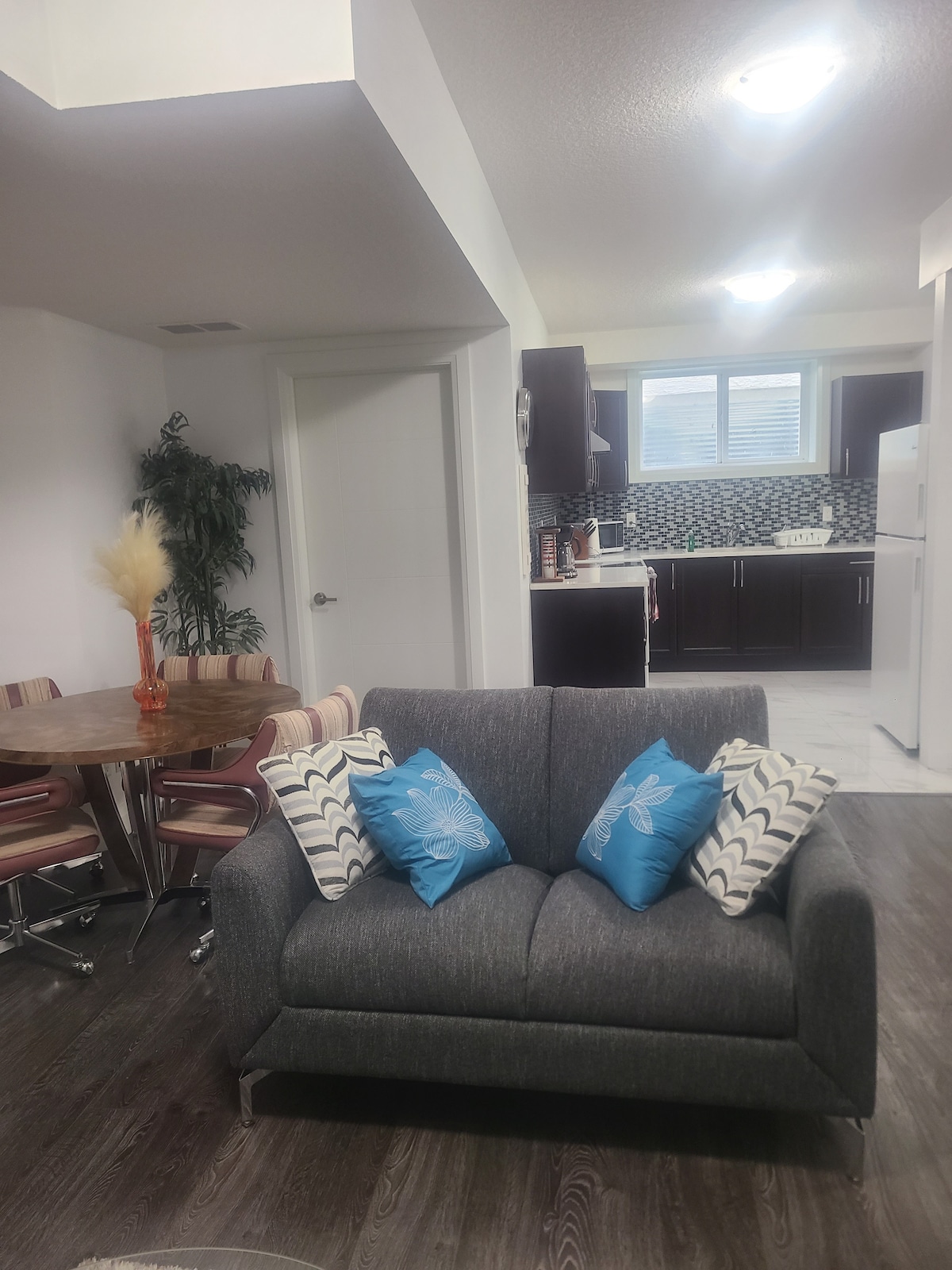 Modern private 1-bedroom basement suite with a separate side entrance in peaceful Trumpeter by Big Lake. Features a queen bed, cozy living area with Smart TV, high-speed Wi-Fi, fully equipped kitchen, and in-suite laundry. Free driveway parking and easy self-check-in. Minutes from West Edmonton Mall, shops, and major routes. Ideal for business travelers, couples, or solo guests seeking comfort, privacy, convenience, and a relaxing stay. Clean, peaceful, modern, and designed for comfort and ease.
