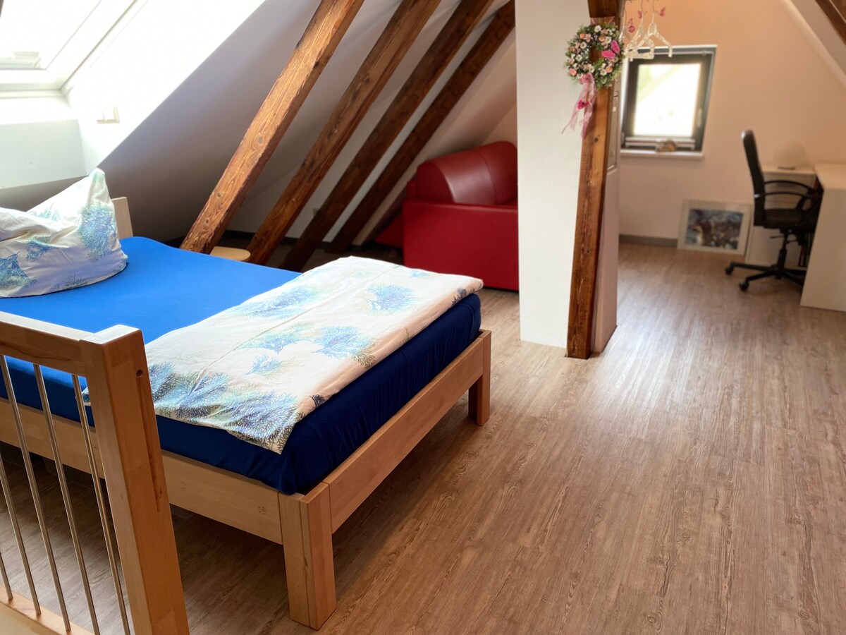 Geräumige 4 Zimmer-Dachgeschoß-Wohnung in gehobener Ausstattung für 6 Personen (maximal 8 Personen plus 1 Baby) mit einer Bodenfläche von 104 qm. 3 Schlafzimmer, eines davon mit Wasserbett, ein Wohn-/Ess-Zimmer, eine kleine Küche und ein Badezimmer mit Whirlpool-Badewanne. Dazu kommt ein Wintergarten (derzeit nicht beheizt) mit 17,6 qm, sodaß den Gästen knapp 122 qm zur Verfügung stehen.