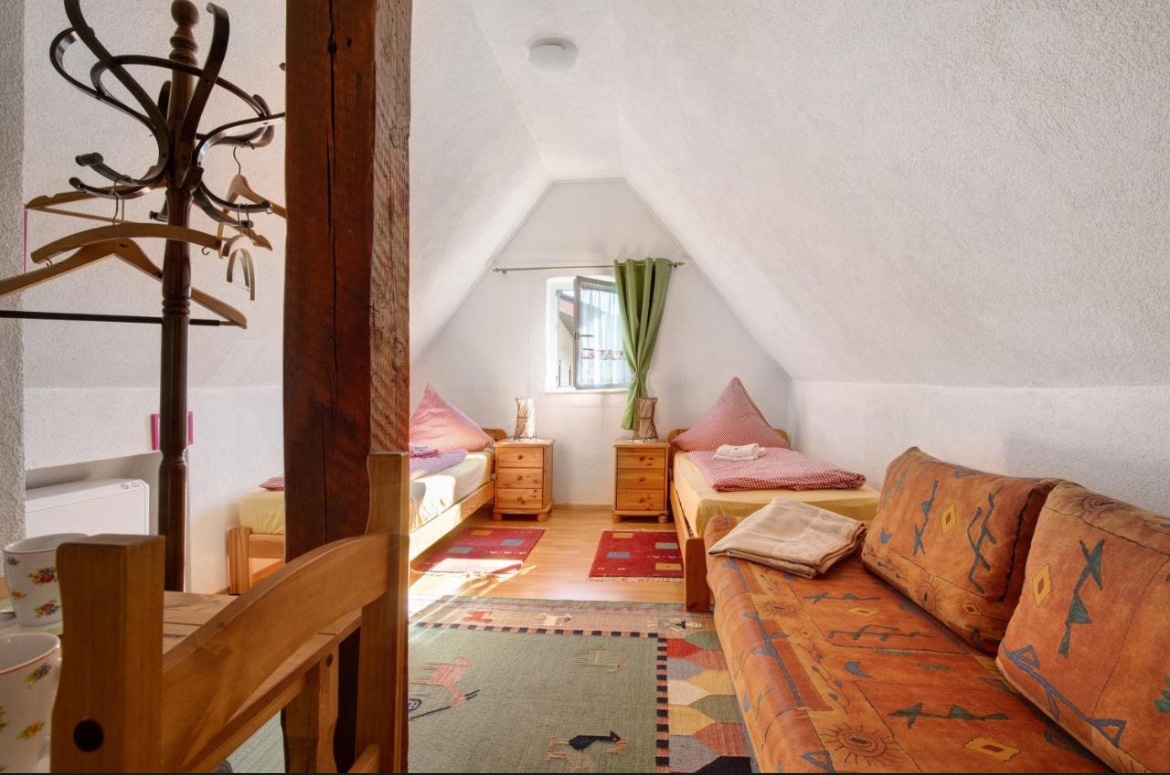 Familien Suite: Schlafzimmer mit Doppelbett, Kinderbett u. integriertem Bad. WC. Wohnbereich mit Bar, Sitzecke u. bequemer Schlafcouch. Galerie im Dachstuhl mit zwei Einzelbetten (erreichbar über eine Leiter- niedere Stehhöhe). Wlan, TV(Internet), Internet. Doppelzimmer mit Dusche u. Waschbecken, Gäste WC. Ausstattung: Handtücher, Bettwäsche, Föhn. Küche: Kühl -u. Gefrierschrank, Herd, Spülmaschine, Toaster, Wasserkocher, Geschirr, gemütlicher Essbereich, Arbeitsplatz mit Computer. Internet.Wlan