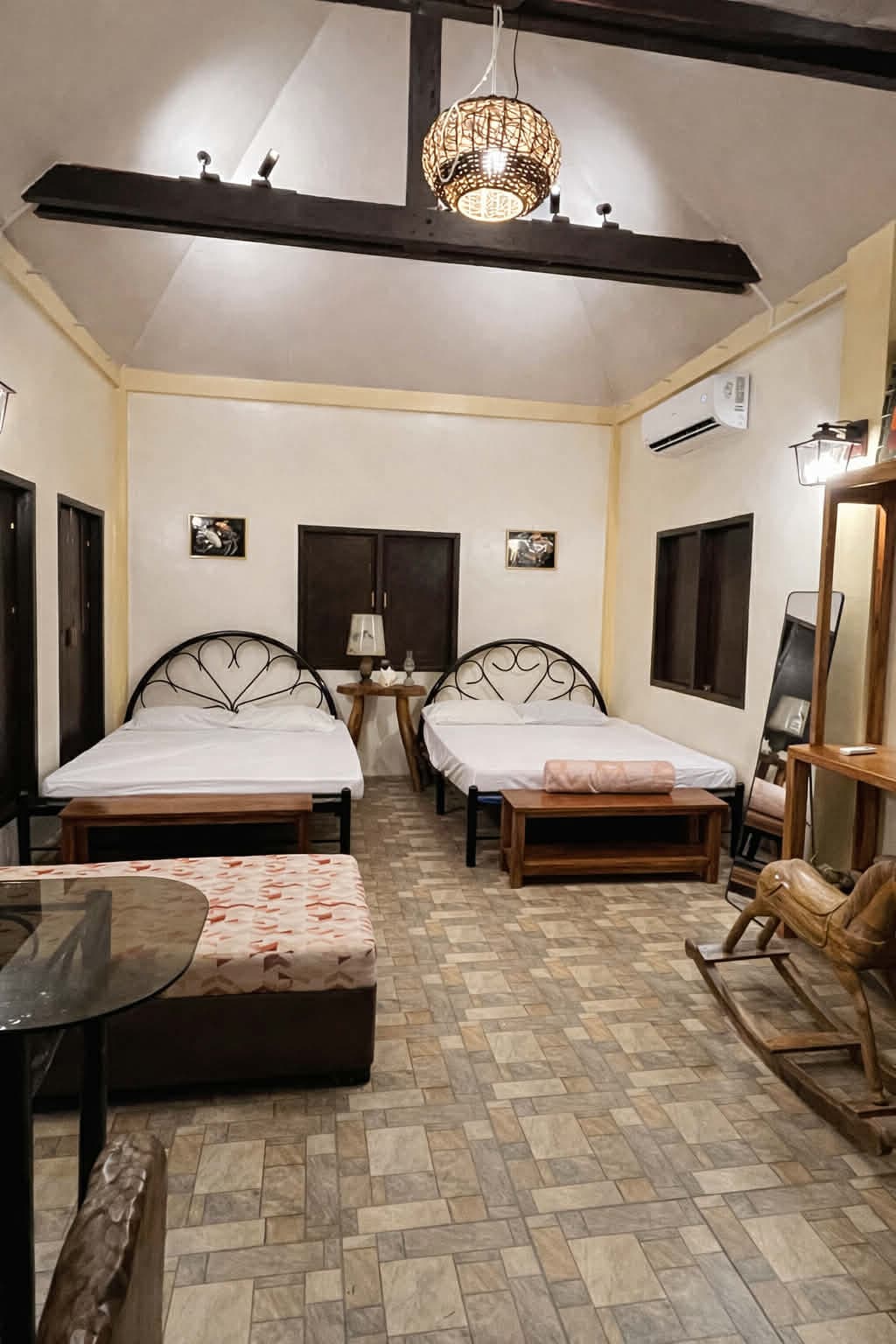 Room 7 Details – Stay for 6-8 pax ✓ Room has 1 double size bunk bed and 2 extra mattress (linen, pillows & extra mattress provided) ✓ With Private bathroom & terrace ✓ With Air-conditioned + wall fan ✓ Own kitchen access (with utensils) ✓ With complimentary pool access ✓ Pet-friendly ✓ Free WiFi & CCTV security ✓ Gated parking & generator backup incase of power interruption or low voltage ⚠️ 3-min walk to the beach (not beachfront) ⚠️ No toiletries or bath towels provided.