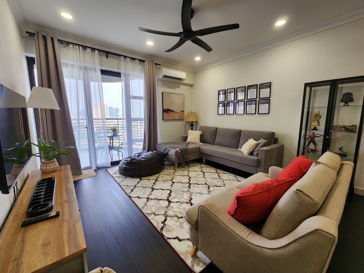 Cozy & Spacious Apartment with Modern Amenities. Our unit is on the 18th floor, offering beautiful city & mountain views of Puchong & accommodating up to 11 guests. Perfect for business travelers, family staycations & parents looking to bond with their little ones in a relaxing environment. Conveniently situated in the heart of Puchong, it provides easy access to restaurants, a cinema, convenience stores, hypermarkets, LRT, IOI Mall, Sunway Pyramid, Sunway Lagoon, Pavilion Bukit Jalil & more.