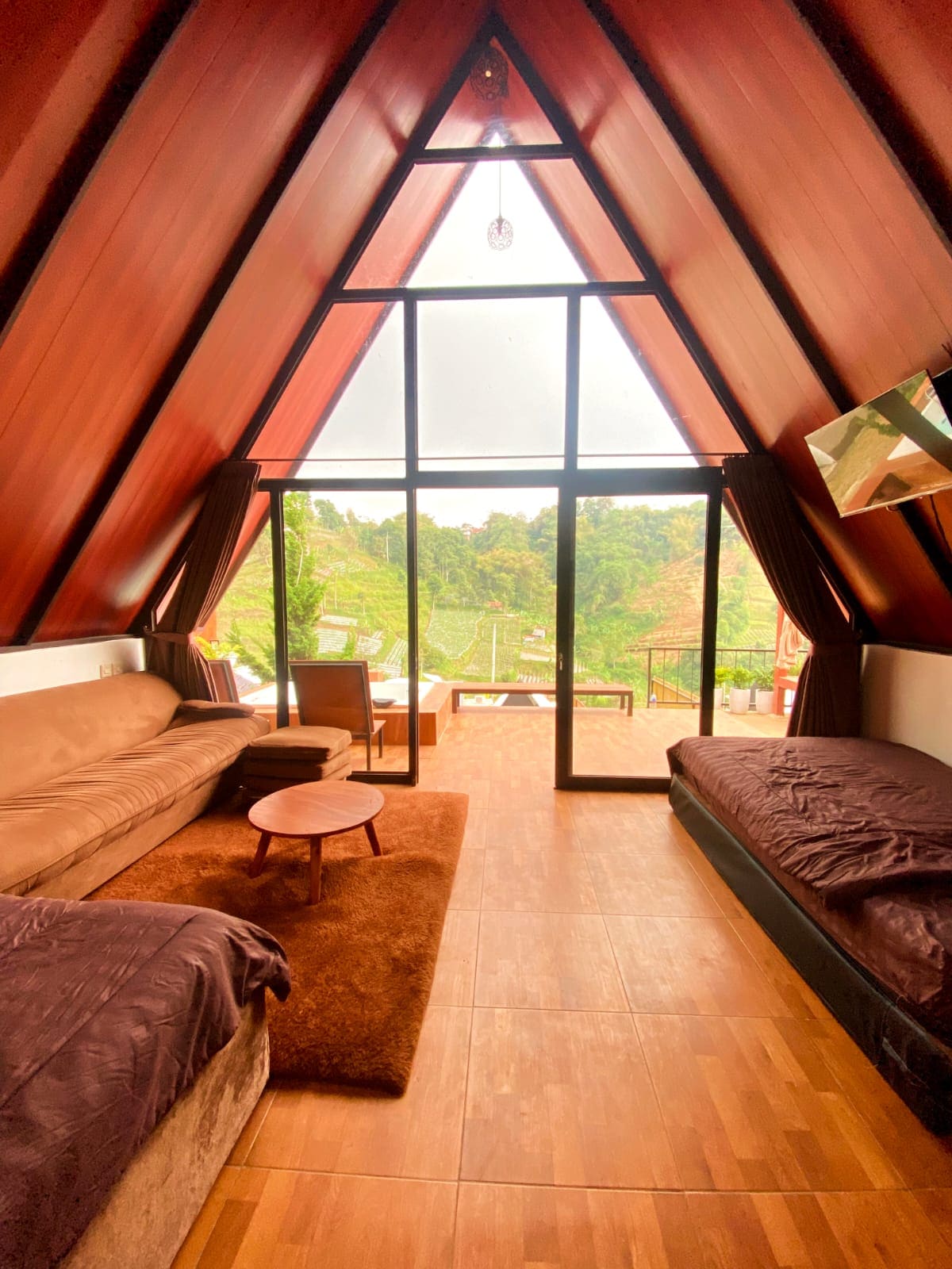 Nikmati pengalaman menginap unik di kabin A-Frame hangat yang terletak di Mano Garden, Lembang. Dikelilingi udara sejuk dan taman hijau, kabin dua lantai ini memiliki ruang duduk nyaman di bawah dan area tidur di atas dengan balkon pribadi menghadap kebun. Fasilitas lengkap, suasana tenang, dan akses dekat ke kafe, kebun mawar, serta wisata populer Lembang menjadikannya pilihan ideal untuk liburan santai.