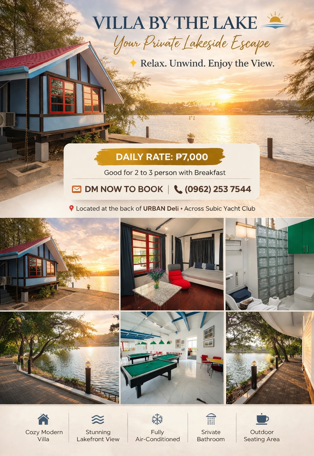 VILLA BY THE LAKE 🌅 Your Private Lakeside Escape ✨ Relax. Unwind. Enjoy the View. 📍 Located at the back of URBAN Deli Across Subic Yacht Club 🏡 Cozy Modern Villa 🌊 Stunning Lakefront View ❄️ Fully Air-Conditioned 🚿 Private Bathroom 📺 Smart TV ☕ Outdoor Seating Area