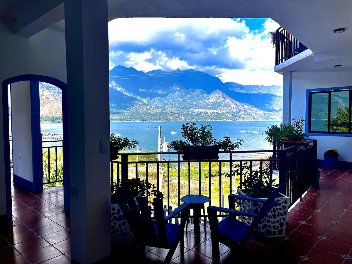 vista panorámica al lago desde la habitación con baño privado y agua caliente. este es un lugar de característica rural donde podrás apreciar hermosas vistas del lago, podrás ver 3 volcanes que rodean al pueblo de Santiago Atitlan y conectar con la naturaleza, y podrás disfrutar de área privada con acceso al lago.