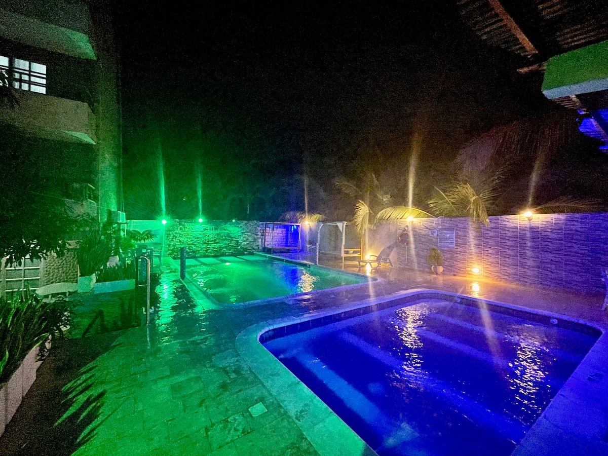 The condominium consists of three houses with a maximum capacity of 10 people each, with two rooms, two bathrooms, living / dining room, kitchen and a courtyard for clothes; All our houses are fully equipped with A / C, ceiling fan KDK, Direct TV, internet, bedding, hammock and a shared area with BBQ, adult and children’s swimming pool, children’s playground, beach volleyball court, basketball board, and parking lot. The Condominium Atlantis is Located at 100 meters from the sea.