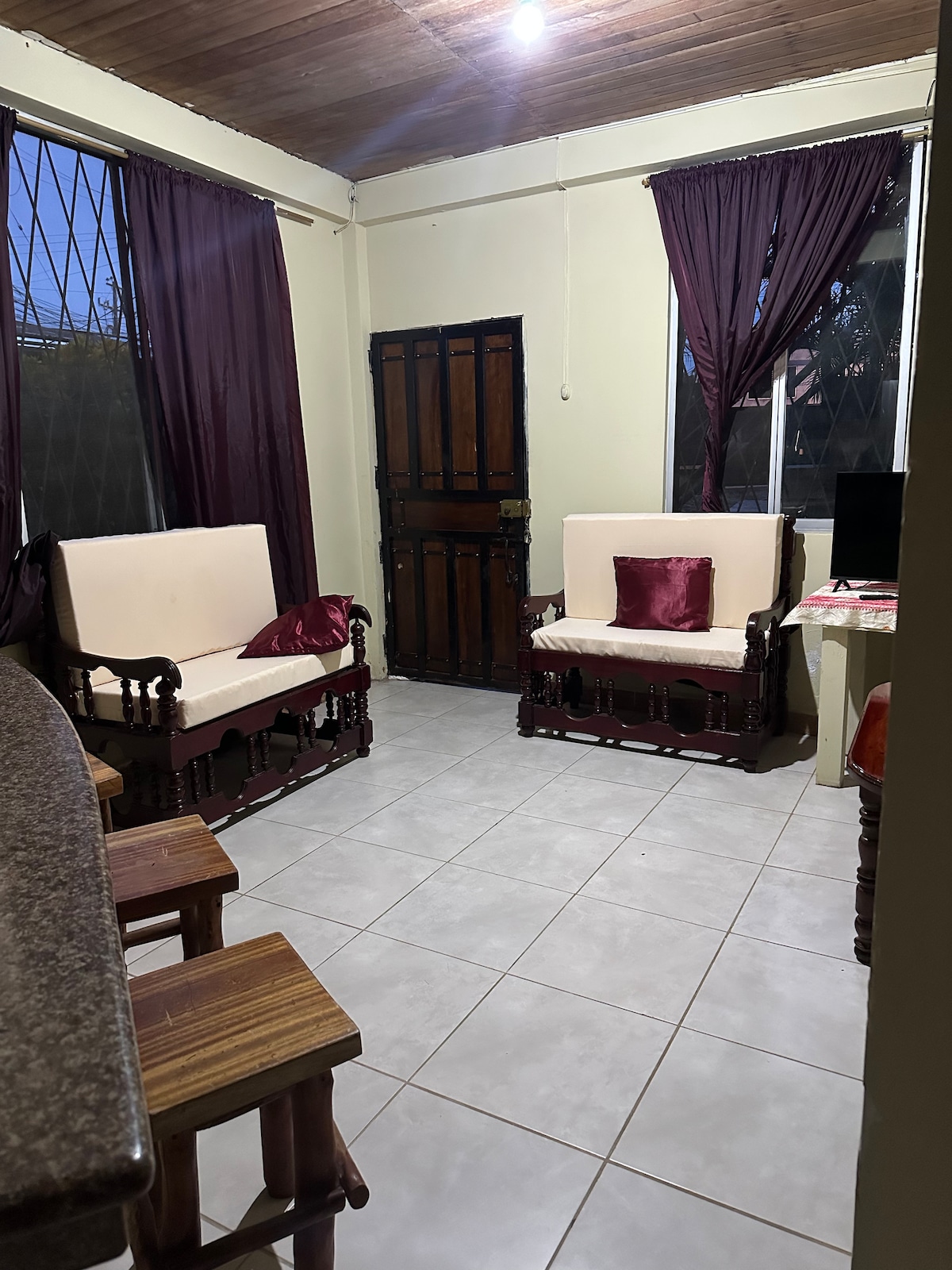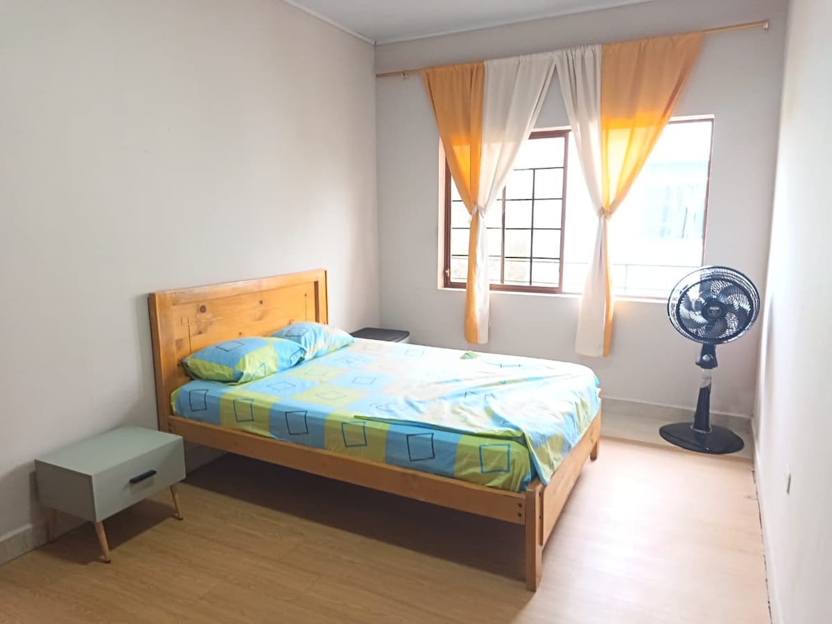 Ideal para parejas, familias o viajeros que buscan comodidad y privacidad. Este departamento moderno y acogedor ofrece un dormitorio principal con cama queen y baño privado, clóset, escritorio y TV. Además dispone de un segundo ambiente con cama doble y sofá, perfecto para grupos pequeños o parejas que desean un espacio amplio sin sentirse abrumadas. La cocina está totalmente equipada y dispone de Aire acondicionado, Wi-Fi, hamaca interior y garaje. Ubicado cerca del Hospital Marco Vinicio Iza.