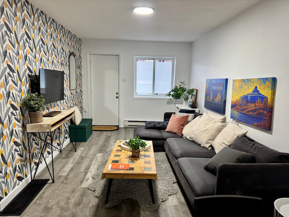 Welcome to our centrally located private unit. Big windows to brighten the fully stocked kitchen, an entertainment space with a 55” smart tv, board games, record player, a comfortable bedroom with a Queen bed & AC unit, and large bathroom. Enjoy the private outdoor area beside your personal parking spot. Kitchen includes: - Toaster - Keurig Coffee Machine + Reusable Cups - Stove - Kettle - Pots and pans - Utensils and other kitchen ware - Microwave - Mini Fridge with a freezer compartment