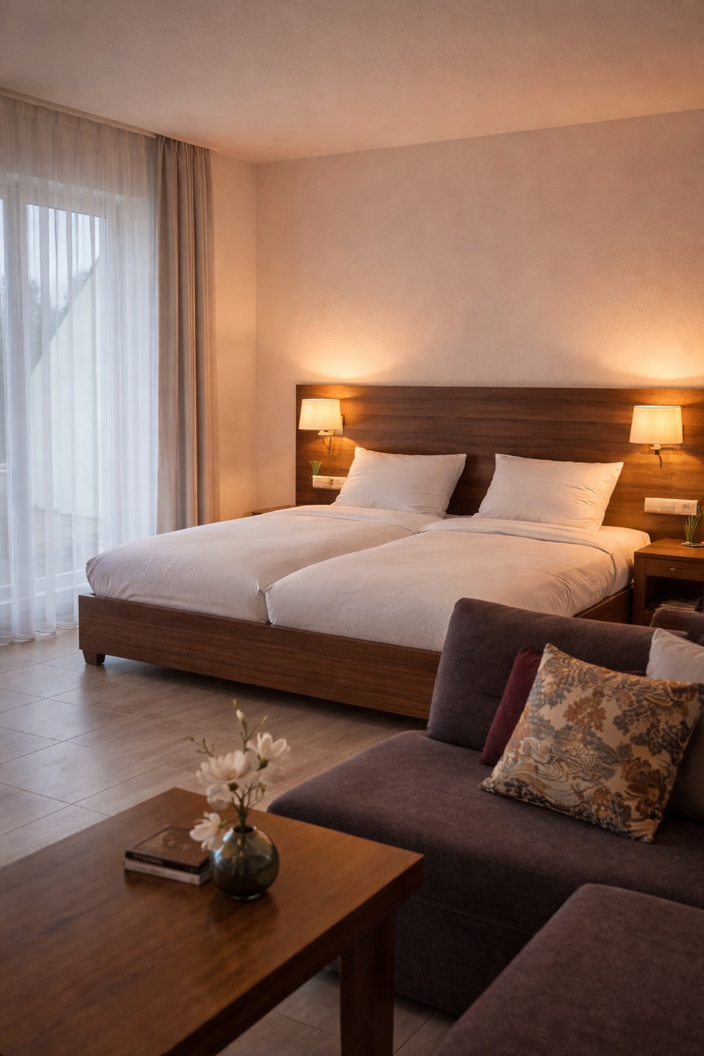 Idealer Ausgangspunkt für tolle Wanderungen und Radtouren oder um einfach ein wenig Erholung im Grünen zu finden. Das Hotel liegt direkt am Waldrand unterhalb des Nedingfelsen. Die Zimmer sind sehr großzügig geschnitten und haben alle einen eigenen Balkon. Die Einrichtung ist funktional, auch wenn die Möbel teilweise schon etwas in die Jahre gekommen sind (diese werden aber Zug um Zug erneuert) - letztlich ermöglicht dies uns aber sehr preiswert anzubieten.