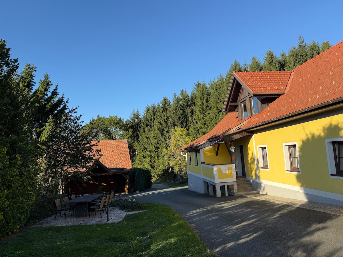Unser geschmackvoll und behaglich eingerichtetes Haus liegt an den sanften Hängen des Südoststeirischen Hügellandes, umgeben von Weingärten, Blumenwiesen, Obstbäumen und Wäldern. Fantastische Aussicht in absoluter Ruhelage nahe der Südsteirischen Weinstraße ("Steirische Toskana") mit ihren Buschenschänken und Spitzenweinen. Auch die Thermen und wehrhaften Burgen des Vulkanlandes sind nicht weit. Ein wunderbarer Ort für entspannte Tage oder auch schöpferisch-kreative Wochen fernab aller Hektik.