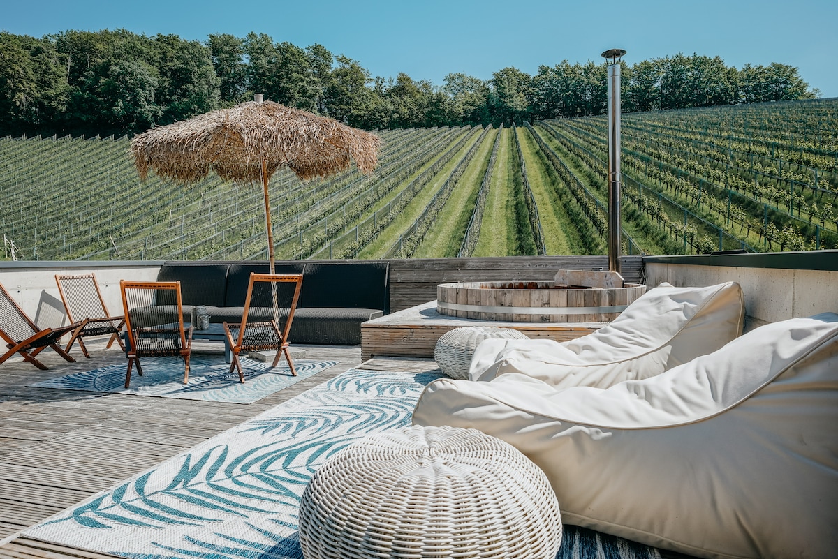 Genießen Sie die atemberaubende Aussicht auf die Weinberge mitten in der Riede Schäming/St. Anna am Aigen. Mit seiner rustikalen Eleganz und modernen Annehmlichkeiten bietet es den idealen Rückzugsort für Paare, Familien und Freunde. Es verfügt über ein Schlafzimmer, Bad/WC, Küche für 4 Personen. Verbringen sie entspannte Abende auf der Terrasse inkl. Whirlpool mit Blick über den Königsberg bis nach Slowenien. Unternehmen sie Wanderungen entlang des Weinweges der Sinne. Buchungen ab 2 Nächte.