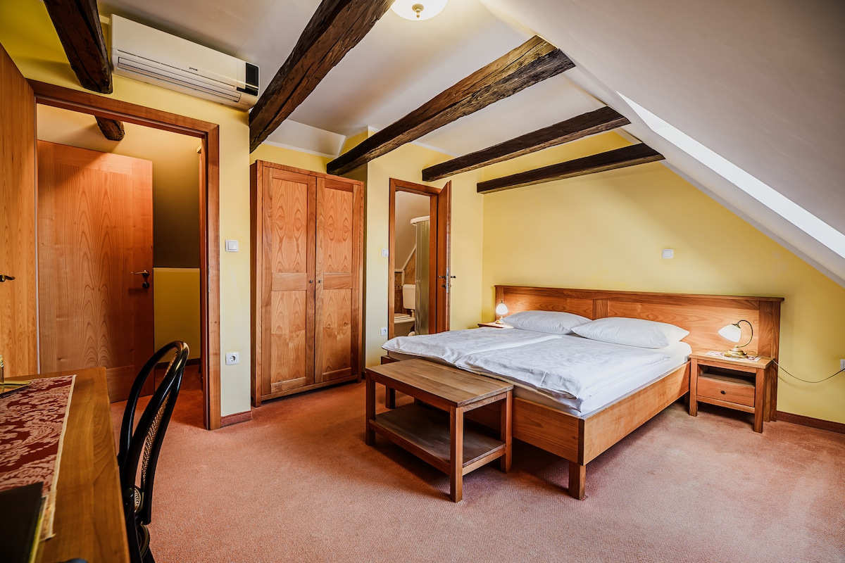 The room is suitable for one or two persons. The bed, size 160 x 200 cm, is distinguished by a quality mattress for a comfortable sleep. Oiled, solid cherry furniture, fully preserved original beams, high-quality carpeting, stylish lamps and door handles evoke a touch of tradition. The bathroom has a shower, sink, toilet, hairdryer and accessories for personal hygiene. Air conditioning, heating, CATV-flat-screen TVs and free WIFI. Pets are not allowed.