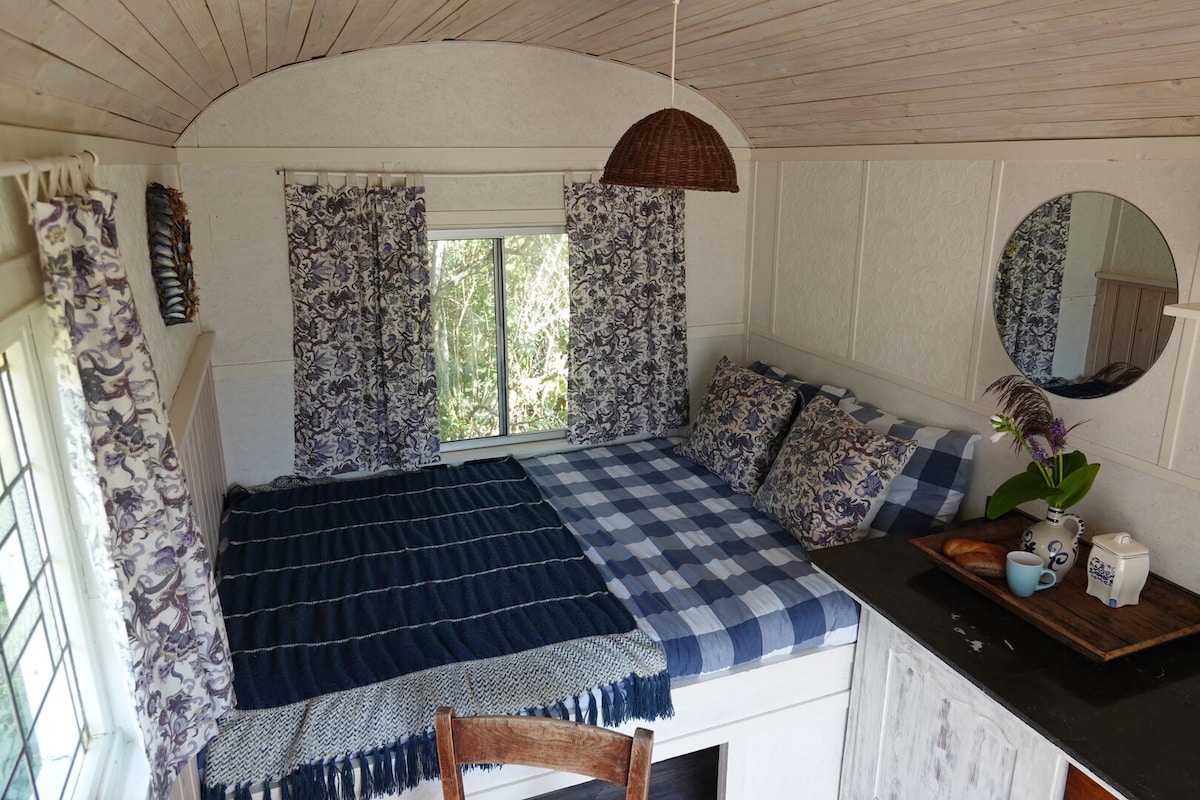 The gypsy caravan has a romantic interior for 2 people and incl. a double bed and heating. There is a small kitchen with a refrigerator,coffee maker, cutlery and pots and pans. Outside the caravan is a nice porch with furniture and a grill. On the porch you can enjoy your breakfast or a glass of wine. In the morning fresh bread rolls are delivered. Sanitary facilities are within walking distance. Pets are welcome in the caravans for 10,- per Pet a day. We ask you to keep all dogs on a leash.