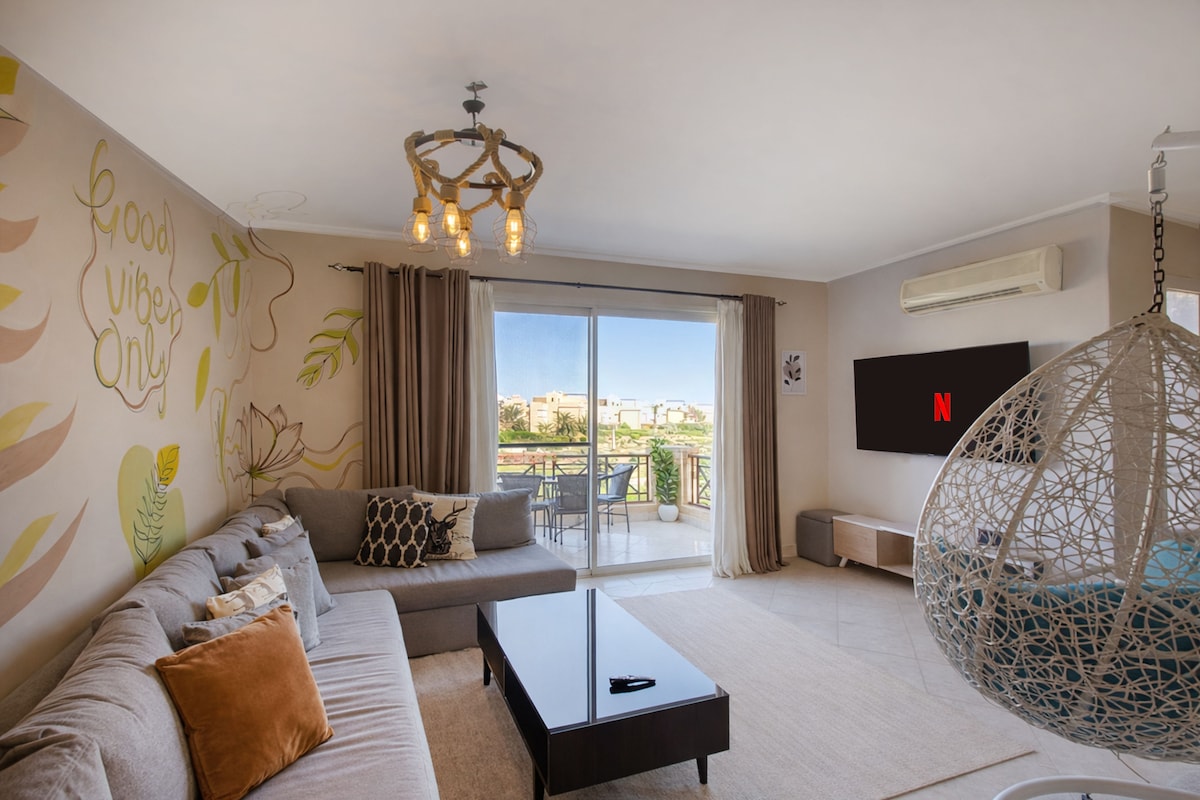 Kick back and relax in this calm, beautifully maintained, two bedroom two bath corner unit in the heart of Ain Sokhna. Completely renovated Wabi-Sabi style home welcomes you with its unique rooms, stunning kitchen, and amazing entertaining spaces immersed with natural light. The view is precious overlooking beautifull swimable crystal lagoons, along with a self-healing green area. Conveniently located close to Cairo Governorate, and about 10 mins from Ain Sokhna gates. “A One-Hour Ride”.
