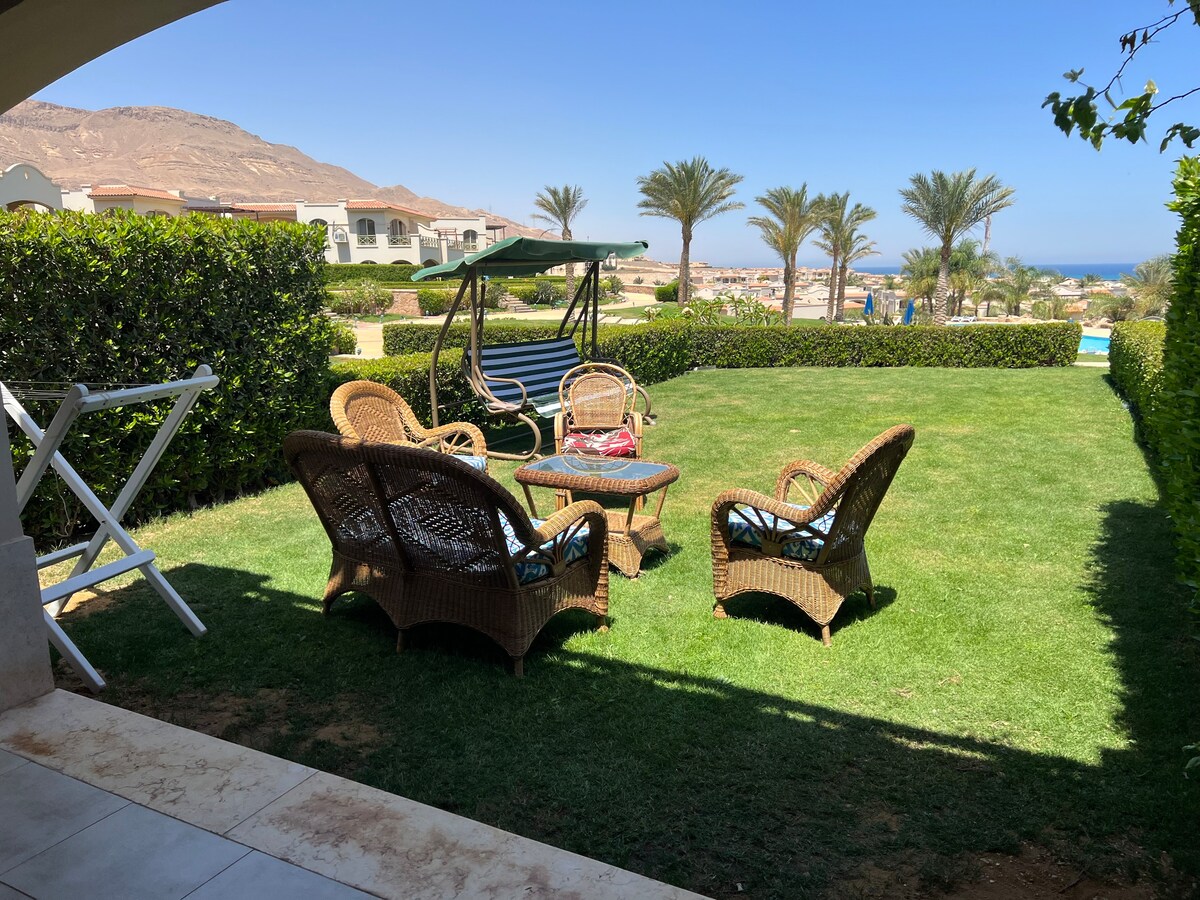 One of a kind first row chalet with a beach front garden that is 10 meters away from the sea in Hegaz Resort Sokhna, 2 bedrooms one of which is a spacious master bedroom with its own bathroom, 1 bathroom, fully equipped kitchen, a grill, 48 inch flat screen with satellite channels.