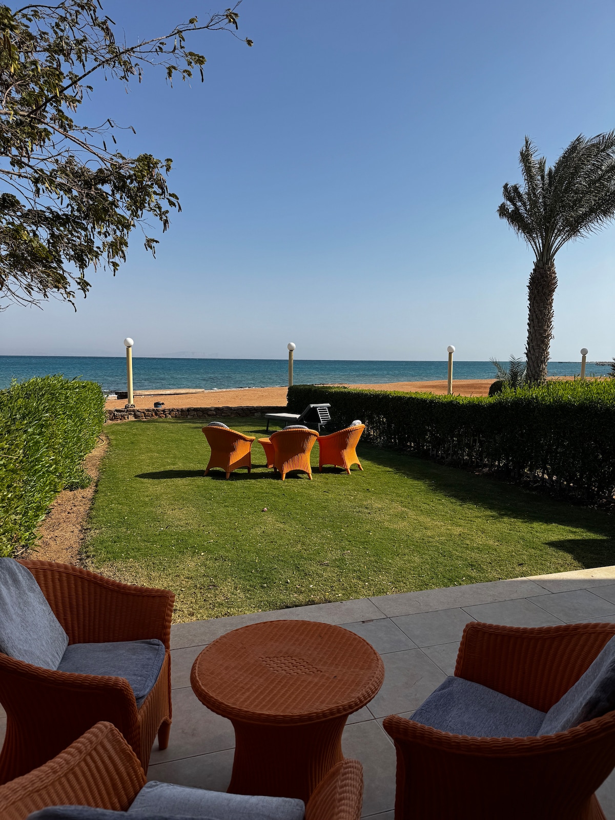 Panoramic Sea View with two air cinditioned bedrooms, 2 bathrooms, open kitchen, air conditioned living area, terrace and a 60 sqm garden. The resort is a Winter and summer resort , just 18 km to the south from Porto Sokhna where you can find several restaurants and cafes. The resort itself is a very quite place ideal for a honey moon, however 15 min drive from several entertainment places.