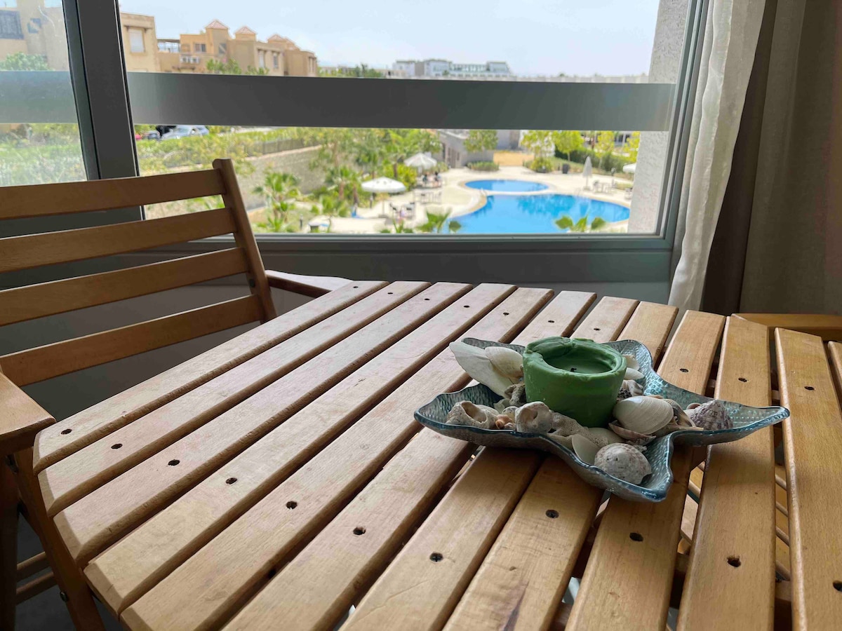 Have fun with the whole family at this stylish place. The chalet is fully equipped and well maintained it over looks the pool from its big terrance and garden and has partial sea view(2min walk), royal beach resort is only 5KM from rassedr town its location is perfect for spending the day at the sandy beach or any of the 3 pools it has also all kitesurfing hotspots are almost 10 min drive and all restaurants and shops offer delivery.