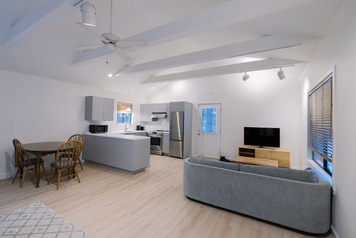 Escape the city, work in nature! Totally private cottage with garden views , central air and heated floors. 1 mile from pristine beaches and center of town, LIRR, Hampton Jitney, 3 large grocery stores, Starbucks, organic market, shopping & restaurants. King bed, cable TV, refrigerator w/ice, microwave, outdoor grill, private yard, Perfect for couples, solo, 1-2 small kids. We welcome small dogs for a $100 fee. Please message us with the size and type. Working couple/owners in main house.