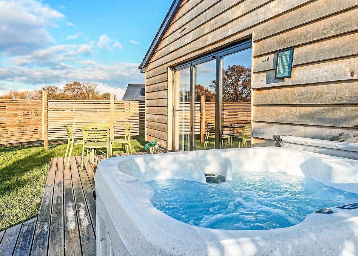 Relax in the luxurious Beachcomber hot tub on the south-facing sun-deck while enjoying the privacy of your own secluded garden. Roll back the bi-fold doors as you relax inside the shade of the lodge. Discover our pretty local villages and country lanes. We only have four of these hand-built lodges within the grounds of our country home, and they are special buildings for our special guests, many of whom return. Fully fitted kitchen for self-catering, king-size bed, outdoor sun-loungers.
