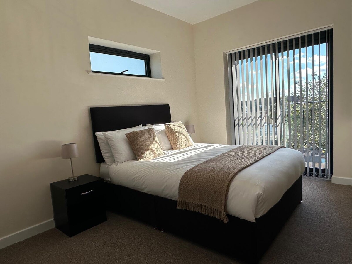 The bedroom features a stylish aesthetic, furnished with a comfortable double bed, bedside tables, and a chest of drawers in black. The flat is finished with blinds and curtains to ensure privacy at dusk. There is private on site parking for your convenience The bathroom is not shared and private for your own use Upon arrival, a set of keys will be provided for your access. We look forward to hosting you!