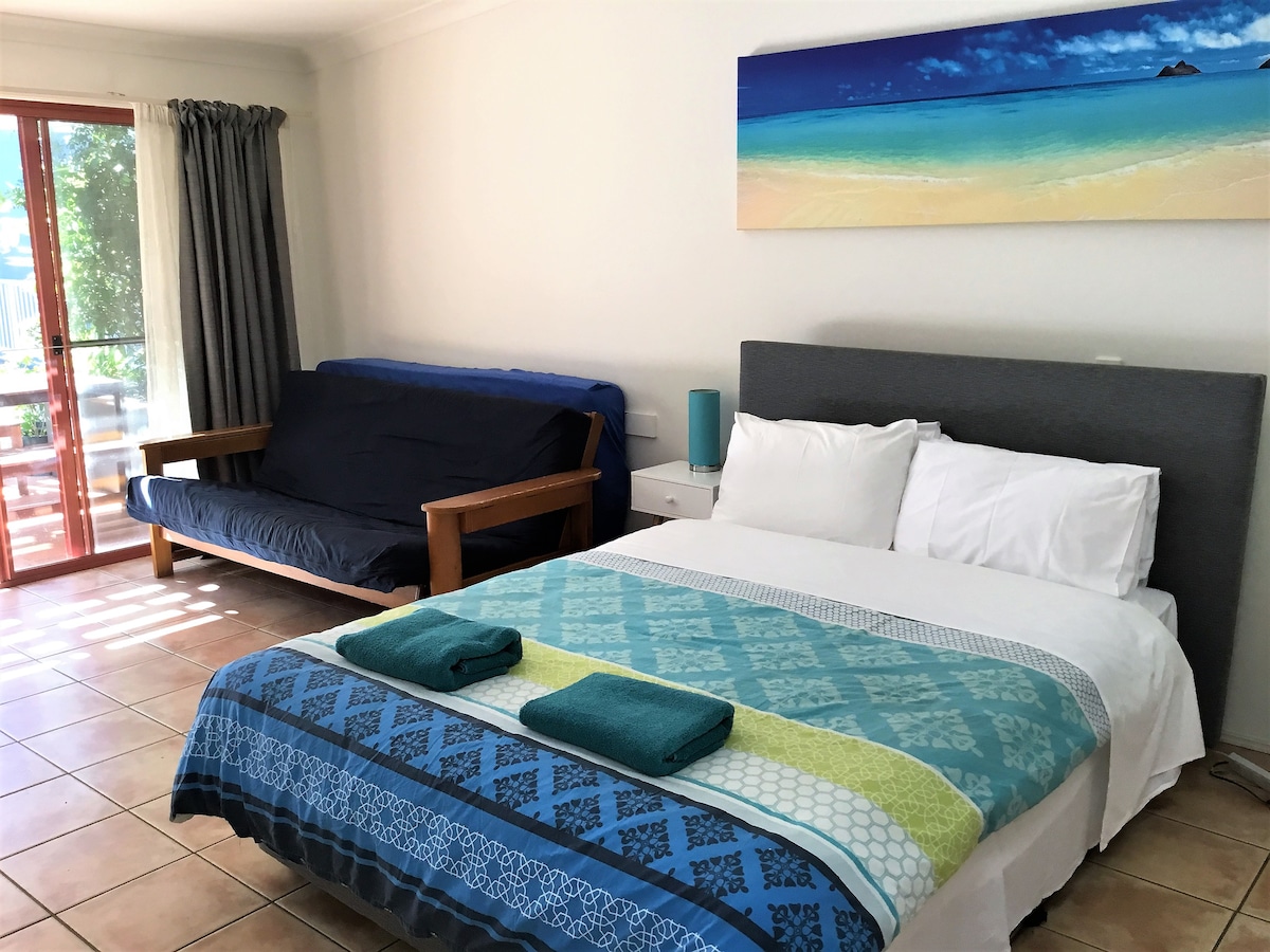 Extra Large Architect designed studio in garden setting with large enclosed deck Open plan studio with queen bed and 1 single bed in enclosed space Equipped kitchenette ,separate shower, basin ,toilet. Off street parking. Very private from main house own back garden and large rear deck Rear yard fenced off for pets BIKES AVAILABLE FREE please note if 3rd person is using single bed extra charge applies