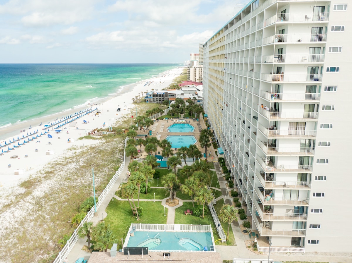 Welcome to your 5th floor balcony view of The World's Most Beautiful Beaches! Beachfront condo at Summit on Panama City Beach! *NEWLY RENOVATED AND DECORATED! Fresh, modern and fun decor! *Condo sleeps 5 with king in master suite, built-in bunks and leather sofa/ queen sleeper. 1 1/2 bath. *Fully-equipped kitchen, all you need to cook and serve meals. *Washer & Dryer in the condo. *Linens/Bath towels and startup toiletries. *Smart HD TV, free Wi-Fi in living room & bedroom.