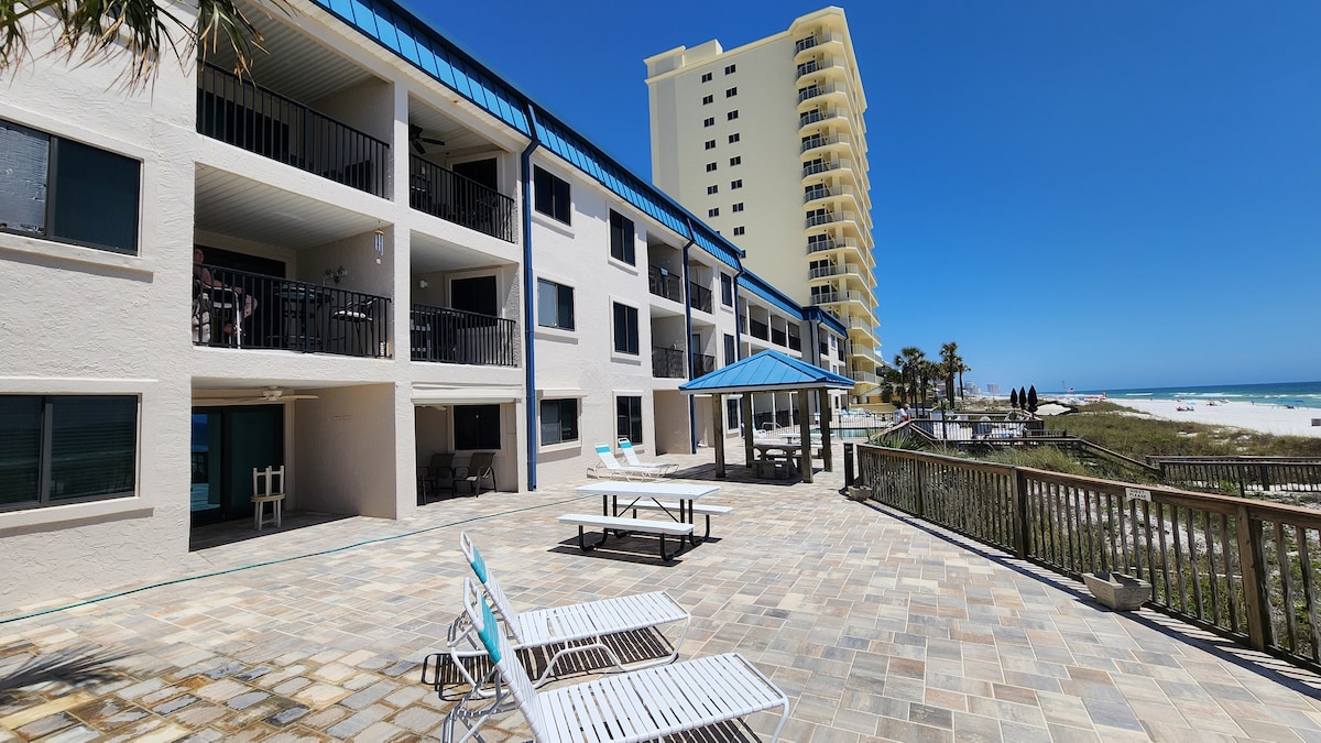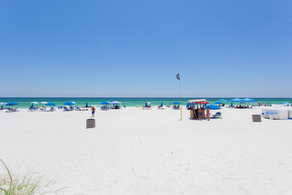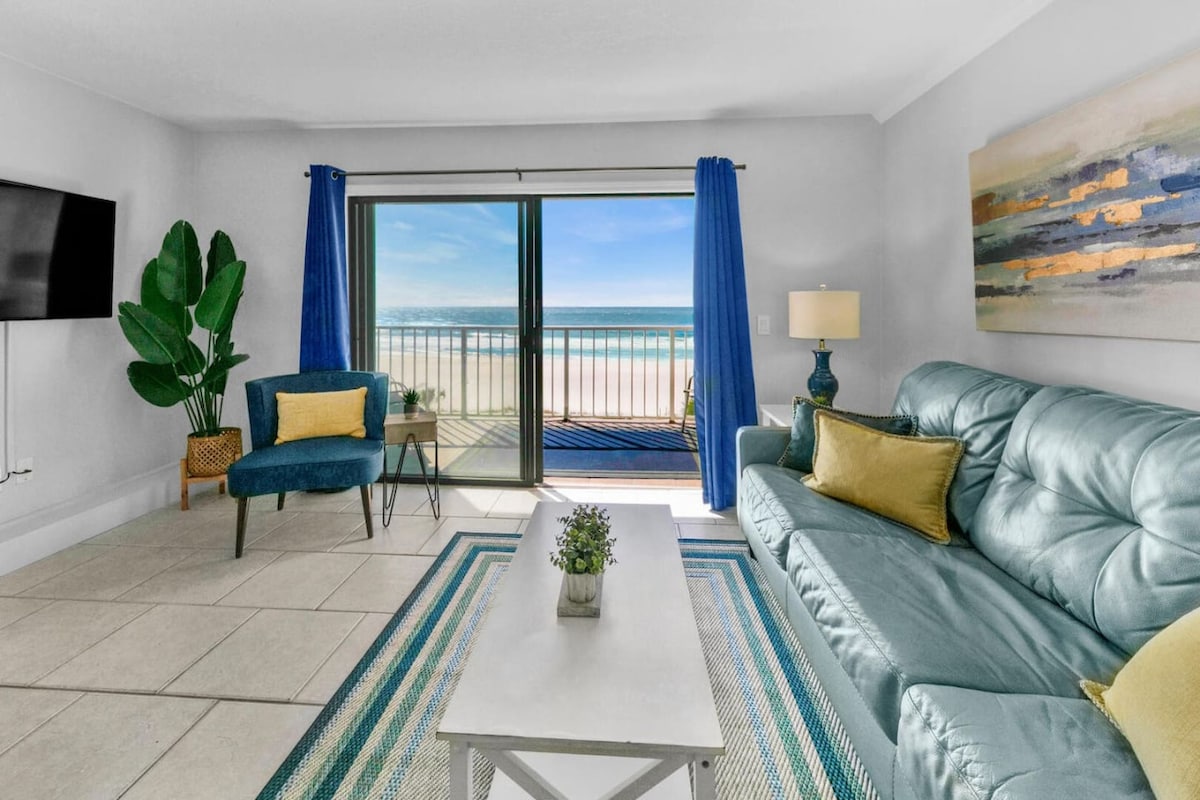 Beachfront. No Age restrictions! Gulf-front balcony with amazing views and superb vibes On the 3rd floor - you get to skip busy elevators if 3 flights of stairs are doable for you. One-bedroom +bunk and 1.5 bath condo - sleeps a total of 6. Master bedroom - 1 king bed with full bath & powder room. The enclosed hallway with a door - sleeps 2 in a bunk bed Living room - 1 queen sofabed. Full kitchen - equipped with: coffee maker, blender, toaster, crockpot, cookware, and dishes WiFi