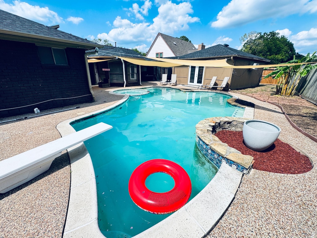 Kick back in our luxurious, relaxing, and spacious home in one of Houston's most convenient locations! ✔ No power black outs ✔ Pool with basketball goal ✔ Well lit Pool ✔ Heated Pool & Spa ✔ Grill ✔ PaknPlay & Baby room ✔ Large 4k TVs with multiple streaming ✔ Board Games ✔ Pool Table ✔ Patio with furniture and dining ✔ Perfect for long stays, big groups and events ✔ Fast Wi-Fi and dedicated working space ✔ Professionally Cleaned & Sanitized ✔ Fully Equipped Kitchen ✔ Laundry Room ✔ Baby Room