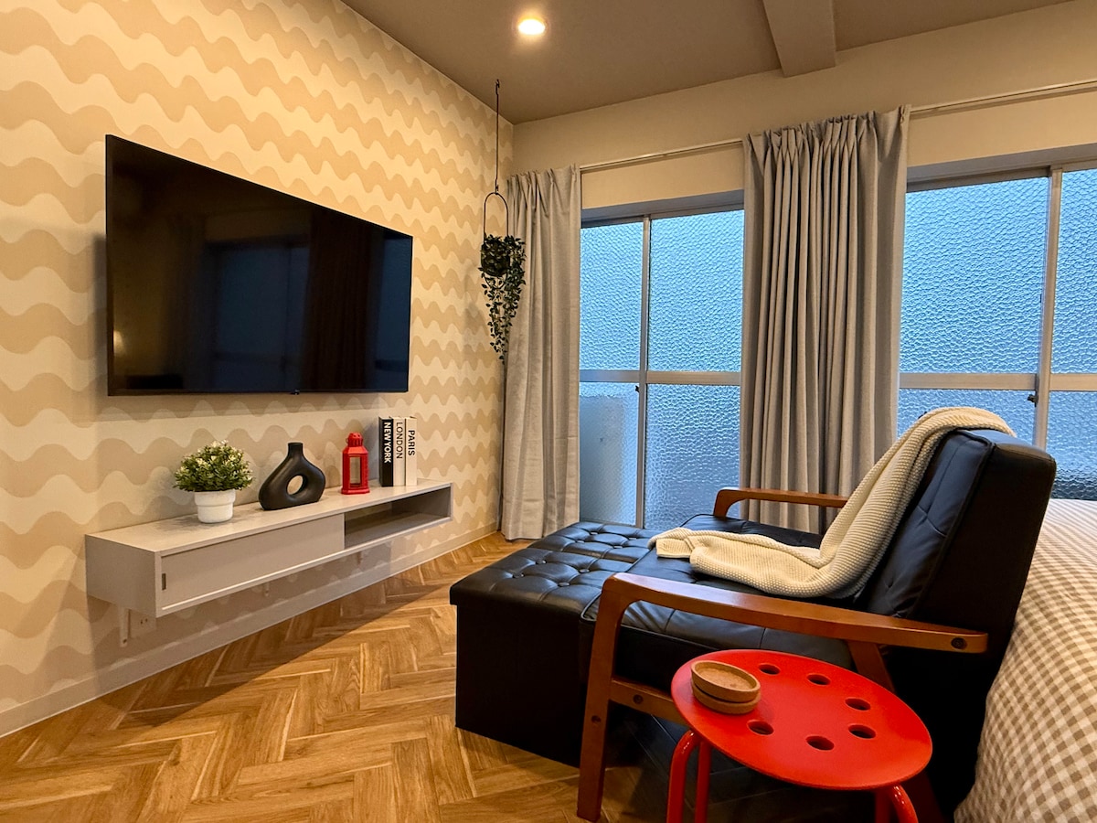 住在这里!标准双人床/50英寸电视/步行1分钟到便利店/洗衣机/Netflix