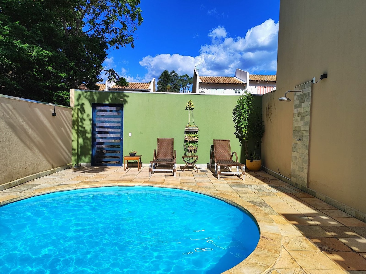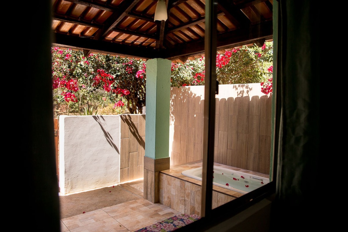 A taxa de serviço fica por nossa conta! Espaço de autocuidado, paz e relax preparado com muito carinho para receber você! Loft ideal para 2 pessoas: - quarto/cama queen, - ar-condicionado, - cozinha completa, - 1 banheiro, - hidromassagem com ducha externa. - disponibilizamos roupão a partir de duas diárias. Área comum: - estacionamento, - área de lazer, - piscina semi-aquecida, - churrasqueira (mediante taxa de uso). A 1km do centro de Pirenópolis.