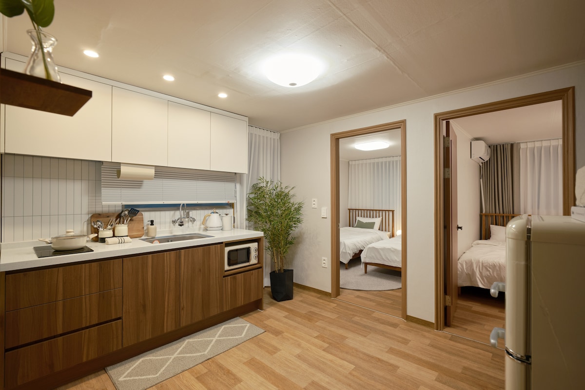 안녕하세요^^ 저희 보나스테이는 청결함과 안락함을 최우선으로 하는 프리미엄 숙소입니다. 모든 침구류는 호텔 전용 100% 순면 제품으로 깨끗하게 세탁 및 소독하여 관리합니다. #오픈이벤트로 외국인 게스트 선착순 100분께 한국 전통 매듭 팬던트를 선물하고 있습니다.(사진 참조) 보나스테이에서는 여행중 필요한 물품은 물론 장기로 머무실때 필요한 모든 물품들을 제공합니다. 화장실 전체 리모델링 공사로 쾌적함을 더했으며 최고의 침구로 양질의 수면을 취하실 수 있도록 정성껏 준비했습니다. 객실 내 세탁기와 건조기는 물론 의류관리기까지 완벽하게 준비했습니다.^^ 주방에는 인덕션과 쿠첸 전기압력밥솥, 500L대형LG냉장고, 전기포트, 토스터기, 전자렌지 등이 준비되어 있습니다. 삼성 공기청정기를 준비하여 실내 공기를 깨끗하게 유지합니다. 안락한 거실에는 65인치 스마트 TV와 엘지 인터넷 TV, 넷플릭스, 디즈니+ 등의 OTT도 준비했습니다. 건물 1층에 무료주차 가능합니다.