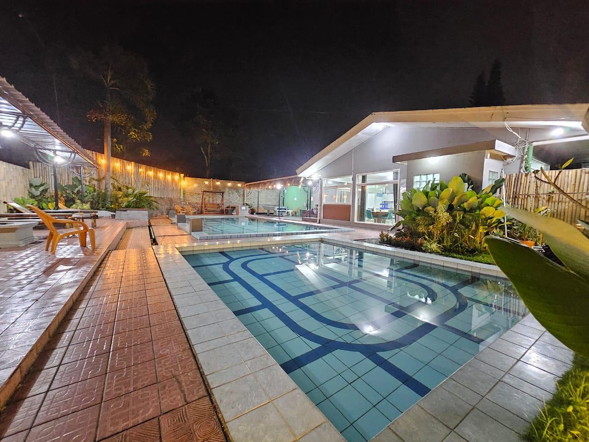 spacious villa for up to 23 guests, offering a serene staycation with a direct view of Mount Salak, complete with 4 bathrooms, full dining amenities, a cozy bonfire area, and the perfect setting for togetherness, healing, or creative shoots.