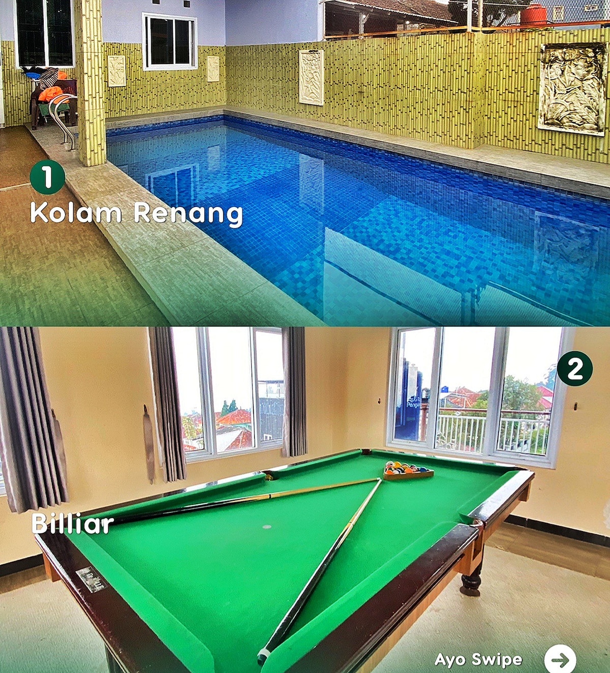 Nikmati suasana tenang di Villa Nature Bliss, tempat ideal untuk melepas penat. Dengan parkir luas dan aman, villa ini cocok untuk keluarga atau rombongan. Kebersihan selalu terjaga, sprei, bantal, dan guling baru dilaundry demi kenyamanan maksimal. Dikelilingi pemandangan hijau, udara segar, dan suasana damai, villa ini memiliki ruang luas untuk berbagai kegiatan. Cocok untuk liburan santai atau acara spesial. Pesan sekarang dan rasakan pengalaman menginap yang tak terlupakan!