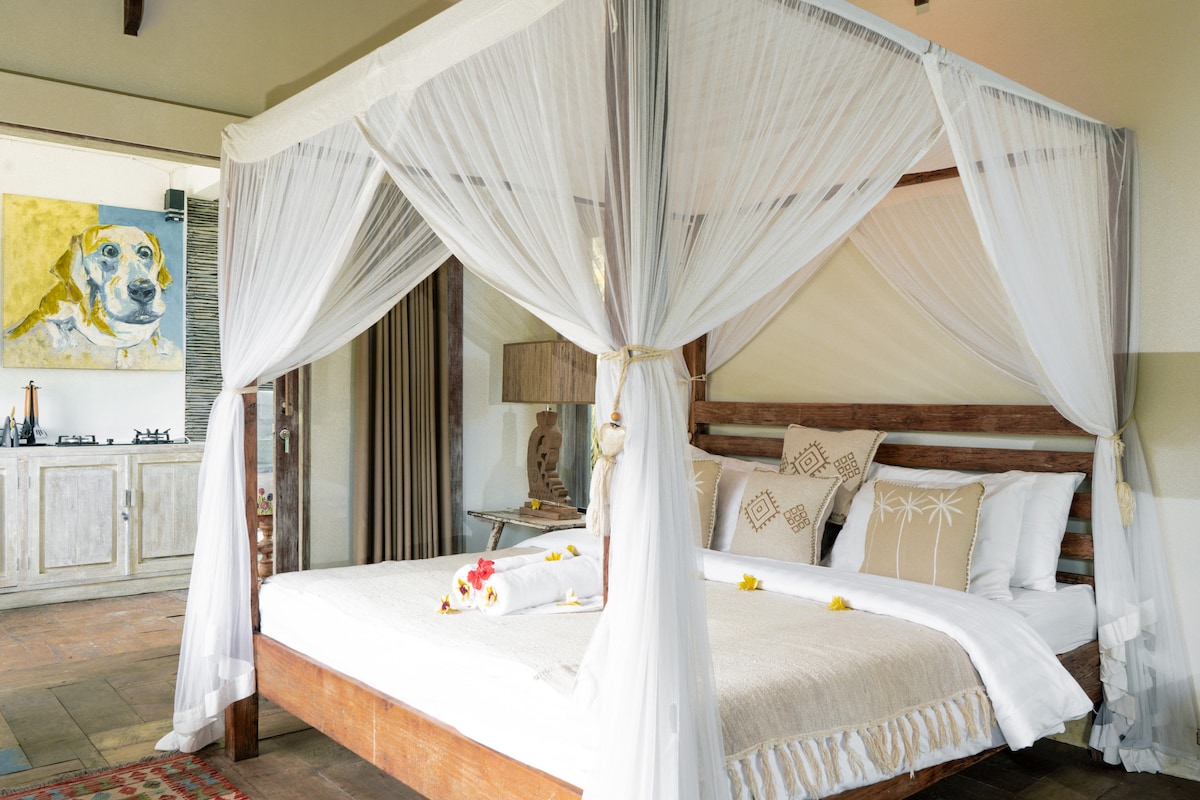 Discover many surprising ways to unwind in this self-contained Villa Bungalow within our sprawling estate. Wander lush gardens, sway in a vintage-style tandem swing, or relax by the natural stone pool. Soak in a designer tub or choose a book that tickles your fancy and relax on the breezy patio/veranda daybed. Your King Bed is like sleeping on a cloud. Also included: - Separate kitchen - Daily maid/housekeeping service - Up to 150mbps Wifi - 8-10 min walk to the beach - Peaceful, quiet