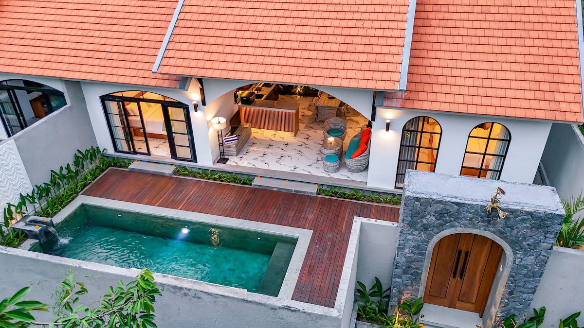 Luxurious private villa with 6x3 meter pool. Secure, private, safe. Lush garden and sheltered but open air kitchen for dining and relaxing by the pool. Queen bed, outside tub and shower, with fish pond view, fully equipped kitchen. AC, TV, great WiFi, daily cleaning and set breakfast is included. We are an 8 minute walk from the main road, or a short scooter ride. This means peace and quiet, and no car noise. Our staff will be happy to drive you in by scooter if needs be.