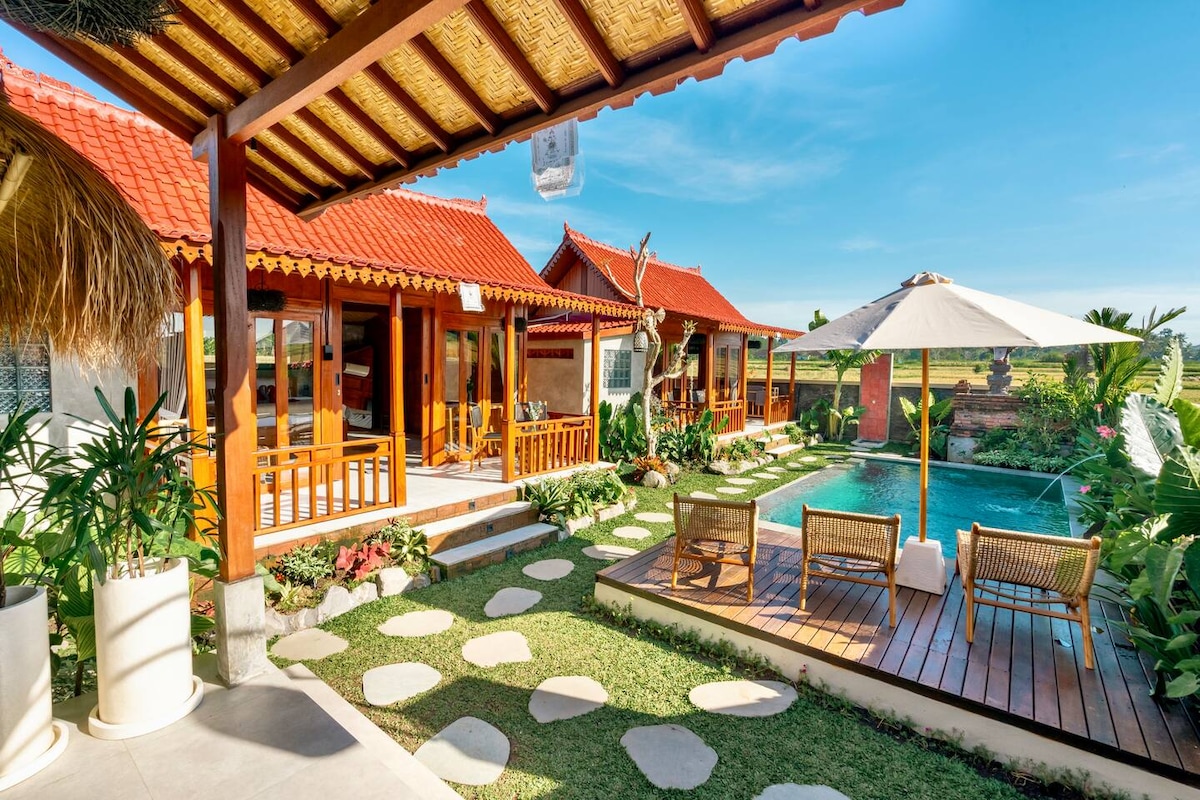 2卧室别墅,私人泳池和稻田景观