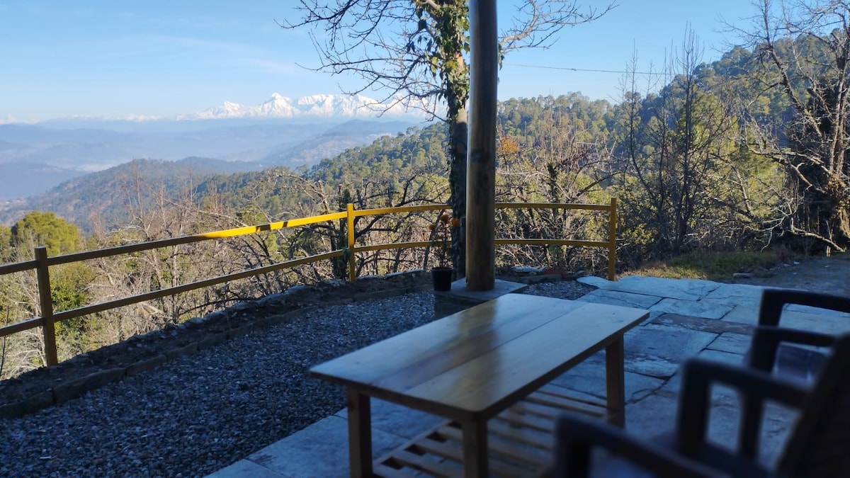 Wake Up in the Clouds – A Private Escape with 180 degree Himalayan Panorama. Pluck an Apple right from the comfort of your Balcony. Tucked away in the beautiful village of Shasbani in the serene hills of Mukteshwar, this private cottage offers an unrivaled front-row seat to the mighty Himalayas. Imagine waking up to seven layers of rolling hills, the sun rising over snow-draped peaks like Nanda Devi and Trishul, and a vast, uninterrupted skyline that stretches as far as the eye can see..