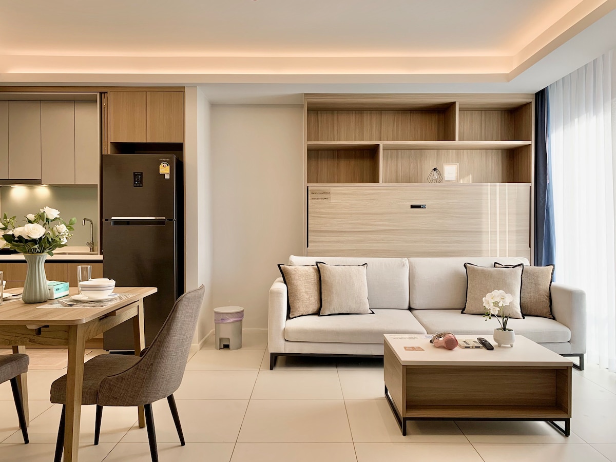 Welcome to our cozy high-ceiling apartment on the 27th floor of Edge Sukhumvit 23. It’s just steps from BTS Asok and MRT Sukhumvit. The living room is bright with full-height windows, while the loft-style bedroom gives you both an upstairs sleeping space and a downstairs work area with an extra bed. Best of all, the pool and gym are right on the same floor, making it easy to relax and stay active during your stay.