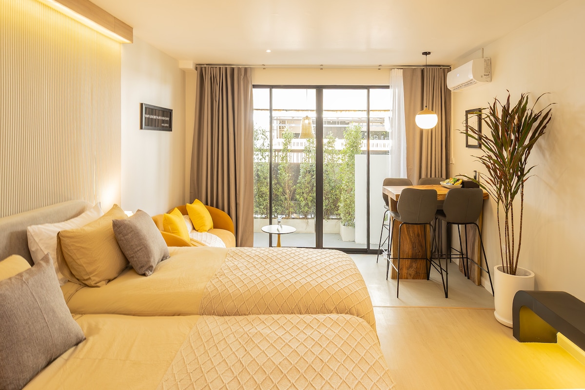 Spacious 62sqm pet-friendly suite, featuring a large balcony! Designed with an open living space that includes a smart TV, working area, 4-seat dining table, and fully equipped kitchen. The bedroom boasts a king-sized bed, another smart TV, powder area, and walk-in closet for your comfort. Both the living and bedroom provide access to the 4-fixture bathroom, which includes a relaxing bathtub and shower.Enjoy amenities such as swimming pool, gym and complimentary shuttle service during your stay!