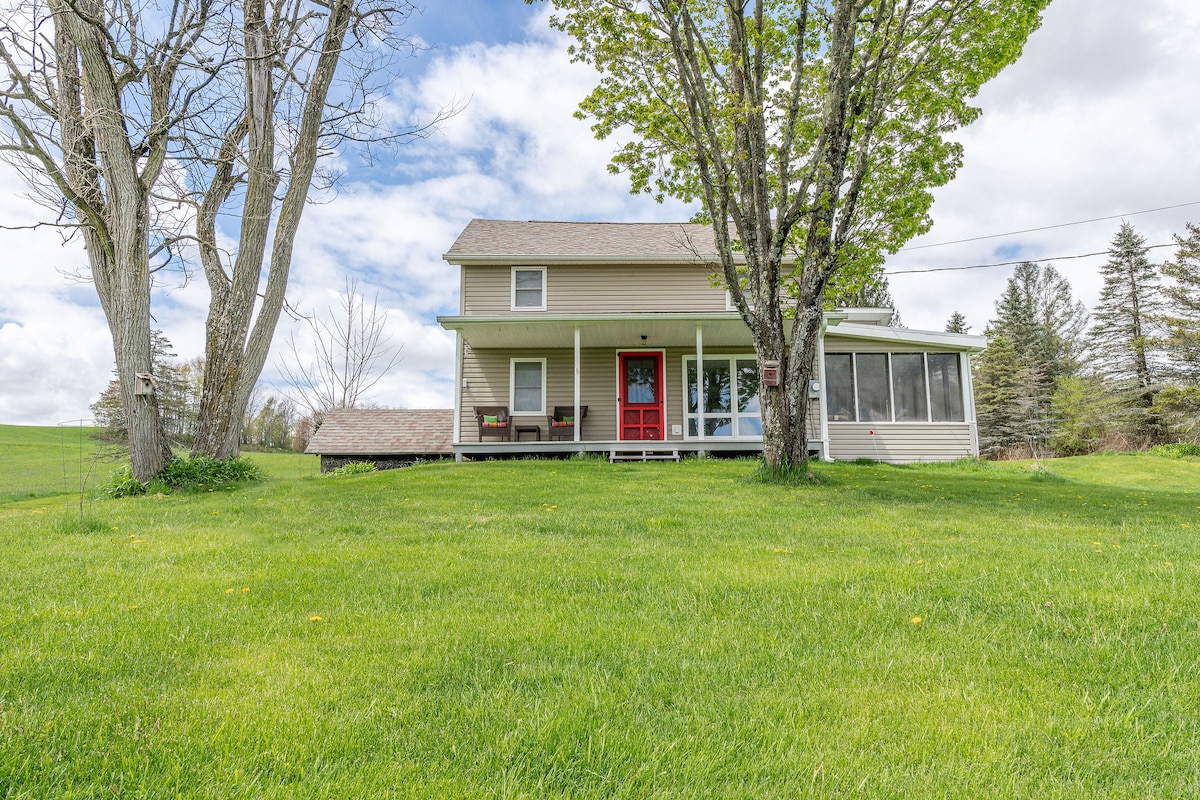 This 90-acre former dairy farm has the most exceptional land with trails that cross huge meadows, woodland, and breathtaking panoramic views. The farmhouse, built in 1892, has a refreshing modern Scandinavian decor with four bedrooms, library, kitchen, living room and an enclosed patio for outdoor meals. In the garden shed, a hidden Finnish sauna awaits you. The pond, perfect for swimming, overlooks the mountains views. Two bikes available for nearby exploration.