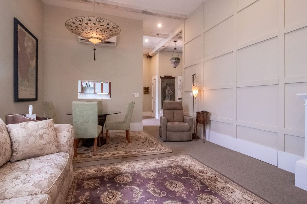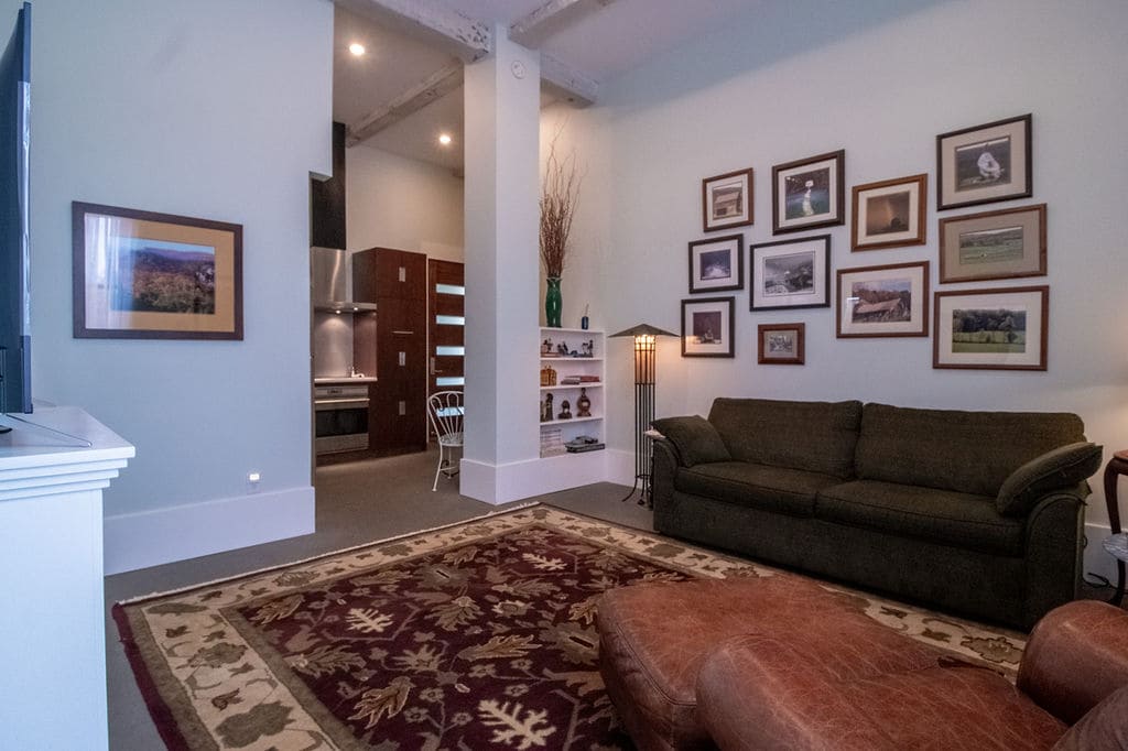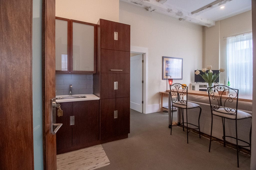 Our suite boasts a unique charm, with many of the original features and architectural details still intact in this historic 1935 building. Our one-bedroom suites are 650 square feet luxury suites, complete with bedroom, bath, living area with queen sofa sleeper, Wi-Fi, Roku TV and fireplace. Offer a fully functioning kitchen, perfect for extended stays.