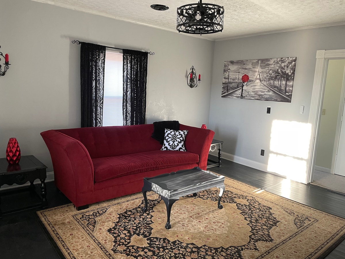 We offer weekly/monthly discounts. This is a large one bedroom duplex. It has been decorated elegantly with a Paris theme. There is a fully stocked kitchen & washer/dryer. The home is centrally located blocks from State Street (TN/VA), where there are wonderful breweries, bakeries, dance clubs, theaters and shopping. Just minutes to The Bristol Motor Speedway (9 miles), The Pinnacle Shopping Center, Steele Creek Park, The Creeper Trail and many outdoor activities as well asTri Cities Airport.