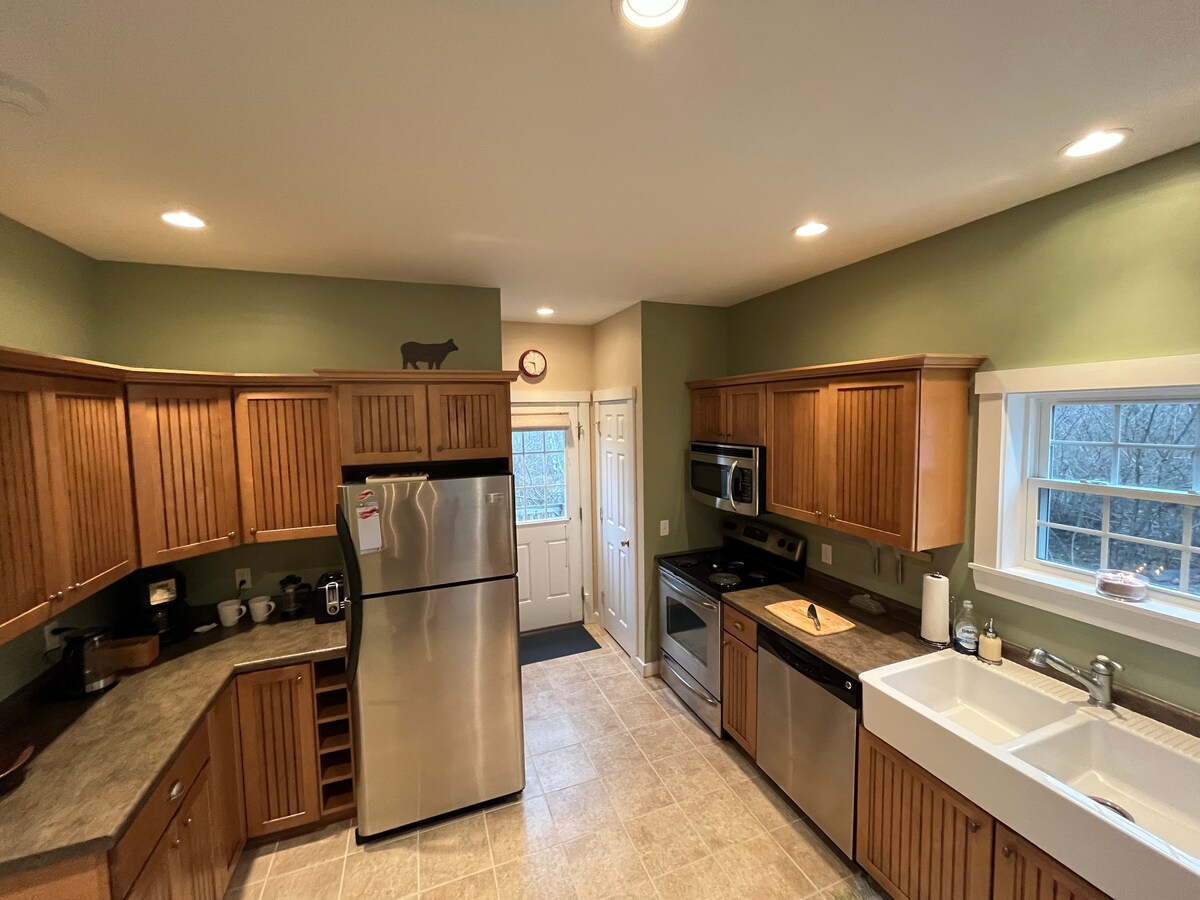 Relax, recharge, & escape here. A unique & peaceful guest house in the woods of Lamoine, Maine with large windows looking out to the woods. Close enough to Bar Harbor / Acadia National Park (45 minutes) but removed from the hustle & bustle. A 10-minute walk down a gravel road to a beach in Lamoine with distant views of Acadia National Park. Enjoy all weather with our new wood stove fireplace surrounded by large windows. We have a comprehensive guidebook for our guests upon check-in.