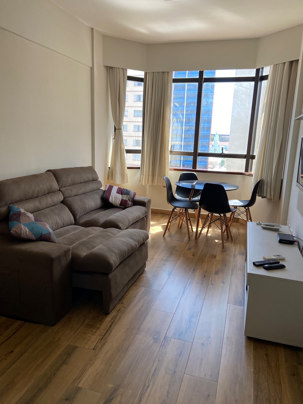 Aconchegante apartamento de um quarto, sala e cozinha americana, no 20º andar, com todas as comodidades, para negócios, estudos ou lazer; com wifi, tv a cabo e dvd player; piscina, sauna, academia e sala de festas na cobertura; salão de convenções; recepção 24 horas; estacionamento pago no subsolo; lavanderia coletiva com fichas. Localizado ao lado do Hospital Vera Cruz, a 5 minutos da Rodoviária, do Mercado Municipal e das principais ruas de comércio; a 15 minutos de Viracopos.