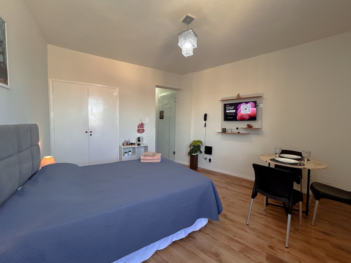 Nesse apto você estará confortavelmente instalado, pode estar certo. Ele oferece tudo o que você precisa para o seu dia a dia - Mesa de trabalho, Internet VIVO FIBRA de 240 Mb, TV Smart de 32', janela imensa com vista sensacional, roupas de cama e banho novas e macias, cozinha equipada e muito mais. A lavanderia é self-service, portaria 24h e garagem para carros pequenos e médios. Será um prazer hospedar você!