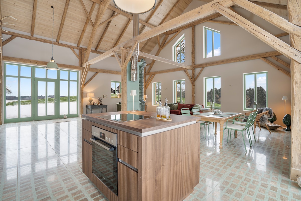 Stylish restored old barn in a stunning secluded location, offering 120 sqm of space with panoramic views of the countryside, a 50 sqm gallery with large windows, an infrared cabin, a walk-in shower, a bathtub, a luxury designer kitchen, terrazzo marble flooring with electric underfloor heating, a historic tiled stove from 1700 and a fenced garden for as many dogs as you like. A dream just 15 min. from Passau, 3 min. from the motorway, and 10 min. from the Danube. Bookable from Nov 2025